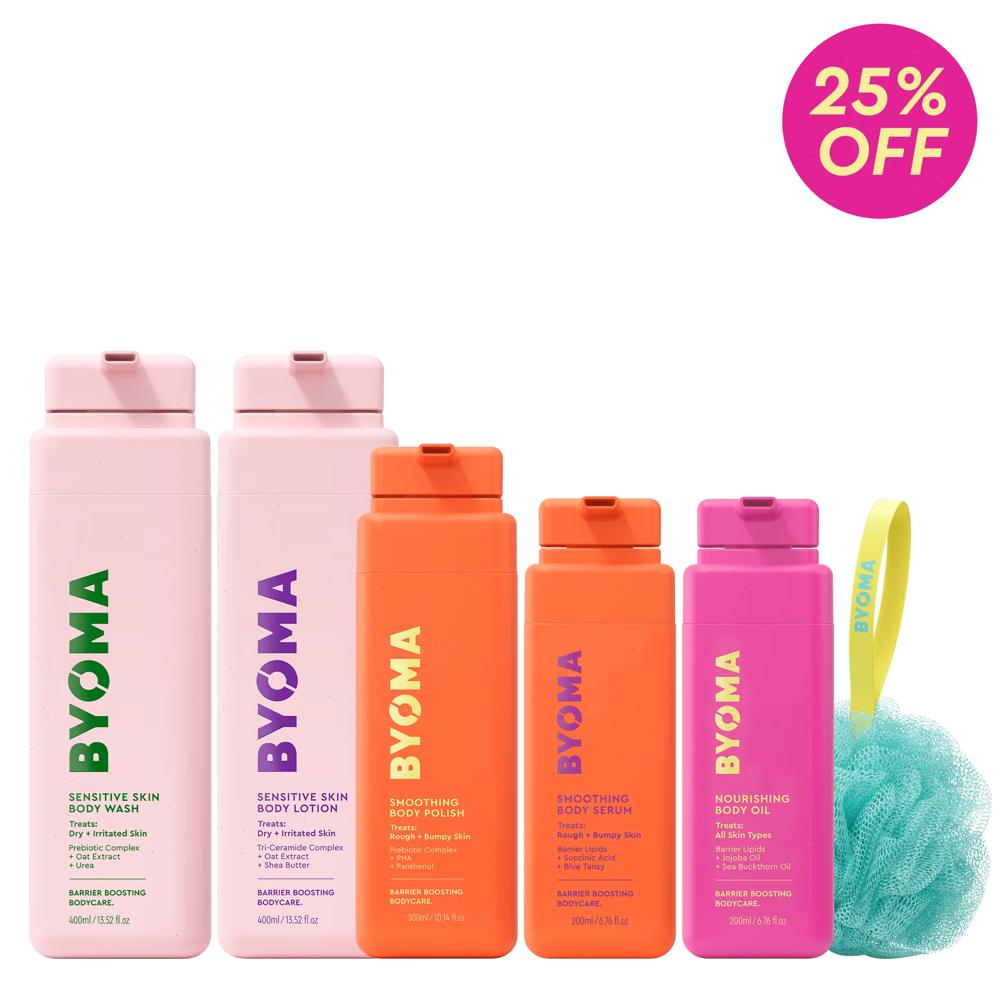 Includes 5 full size products + exclusive BYOMA shower puff